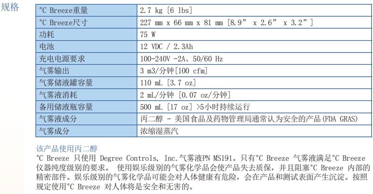 °C Breeze 使用高质量、美国食品及药物管理局(FDA)通常认为安全(GRAS)批准的干净、安全、无毒的化学液体生成气雾。应用范围包括微生物安全柜和化学通风柜认证、医学和洁净技术临界控制验证试验、建筑通风测试、电子系统冷
